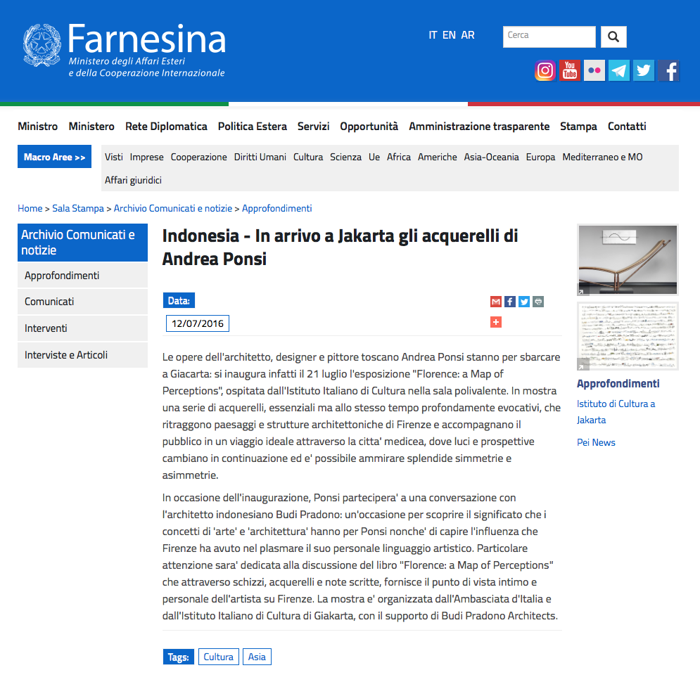 In occasione dell'inaugurazione, Ponsi partecipera' a una conversazione con l'architetto indonesiano Budi Pradono: un'occasione per scoprire il significato che i concetti di 'arte' e 'architettura' hanno per Ponsi nonche' di capire l'influenza che Firenze ha avuto nel plasmare il suo personale linguaggio artistico. Particolare attenzione sara' dedicata alla discussione del libro "Florence: a Map of Perceptions" che attraverso schizzi, acquerelli e note scritte, fornisce il punto di vista intimo e personale dell'artista su Firenze. La mostra e' organizzata dall'Ambasciata d'Italia e dall'Istituto Italiano di Cultura di Giakarta, con il supporto di Budi Pradono Architects.