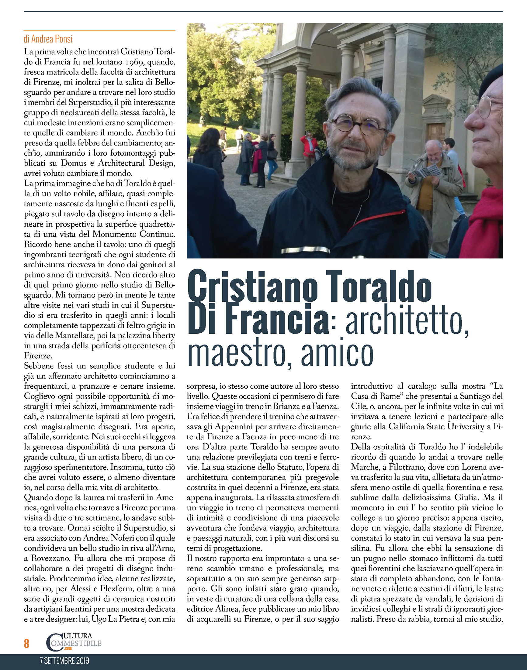 Un articolo di Andrea Ponsi in ricordo di Cristiano Toraldo di Francia , pubblicato su Cultura Commestibile, n. 320 di Settembre, 2019.